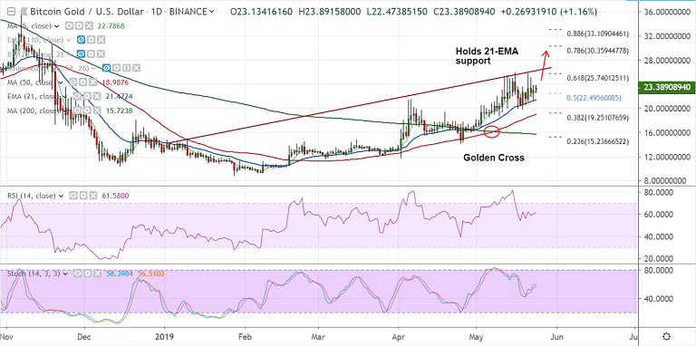 Bitcoin Gold extends gradual grind higher along 21-EMA support, bias higher.