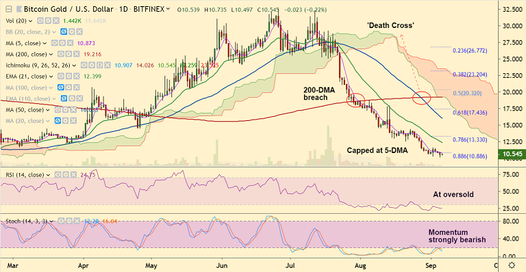 Bitcoin Gold is extending weakness for the 8th straight week, hits 7-month lows at 10.115.