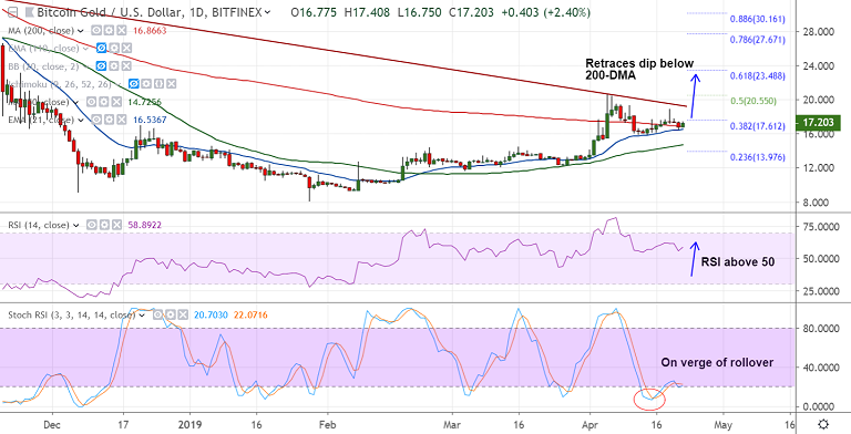 - Price action hovers around 5-DMA at 17.22, break above targets 38.2% Fib at 17.61 and then trendline resistance at 19.35