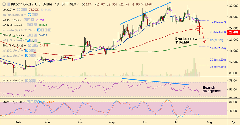 Price action has slipped below 110-EMA support. Breaks below 38.2% Fib retracement.