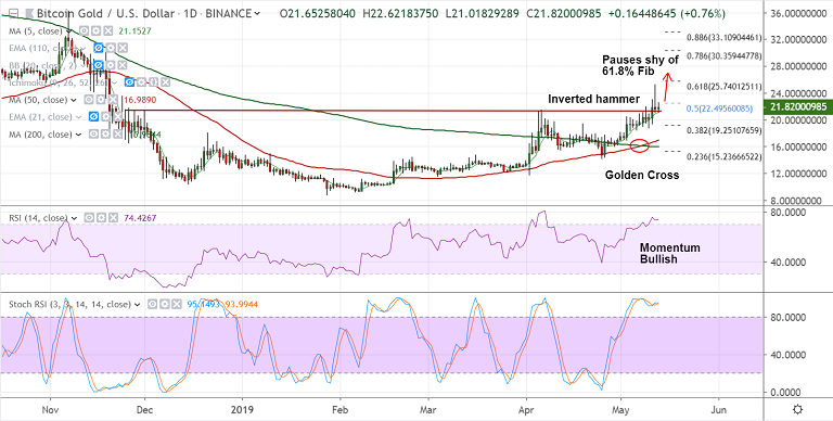 BTG/USD retraces from above 25 hit hit on May 12th, bias still bullish.