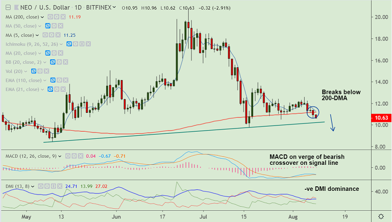 NEO/USD has shown a breach below 200-DMA, opens up scope for further weakness.