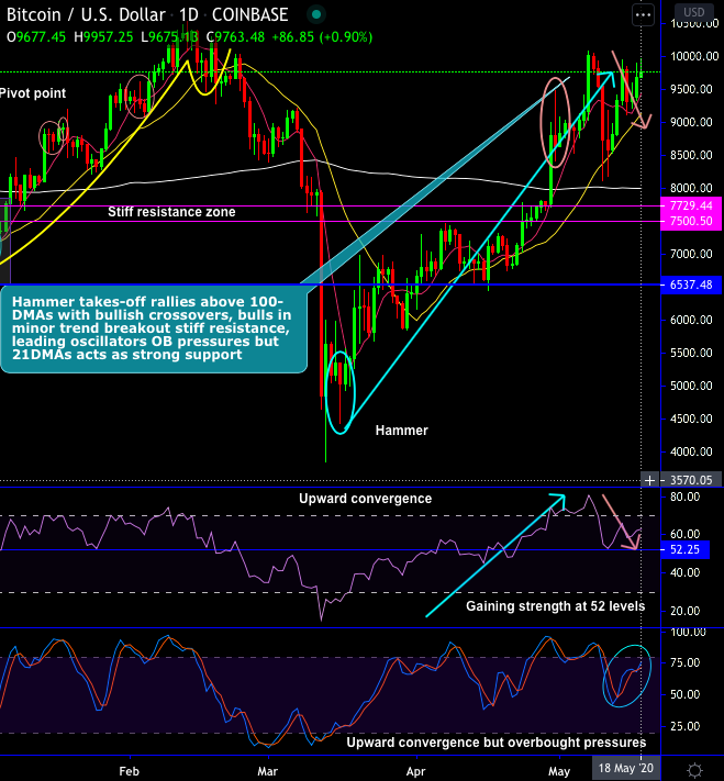 For now, 7 & 21-DMAs levels act as the strong support zone. Since mid-March, BTC has spiked from $3,858 to the current $10,079 which is 160% rallies.