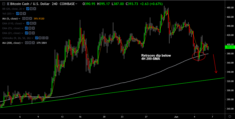 Bitcoin Cash trades rangebound at 393.59 at 11:25 GMT.