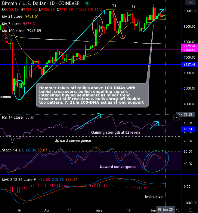 Consequently, BTCUSD (at Coinbase) bears have been drifting sideways today, as bulls have halted below $10k areas and no wonder if it may attempt to extend the rallies above $10,000. Prior to which, hammer takes-off rallies above 100-DMAs with bullish crossovers, bullish engulfing signals intensified buying sentiments, bulls seem to be shrugging-off recently occurred double top pattern, 7, 21 & 100-DMA act as strong support.