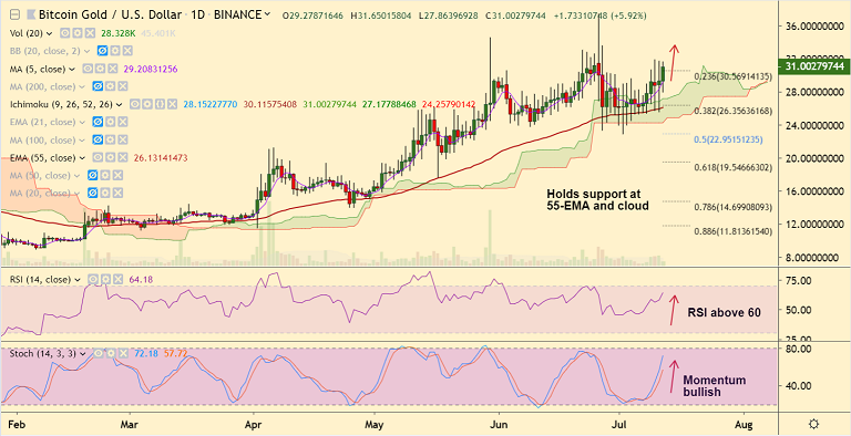 BTG/USD has edged lower from session highs at 31.6501 and was trading 5.46% higher on the day at 30.8740 at 09:00 GMT.