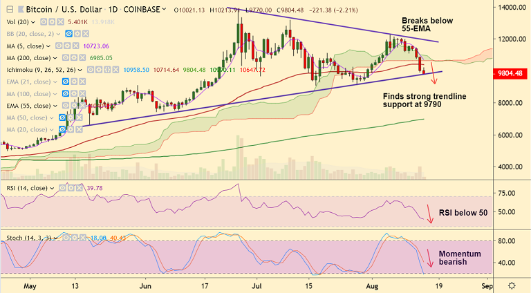 BTC/USD consolidates previous session's slump, trades 2.20% lower at 9800 at 04:00 GMT.