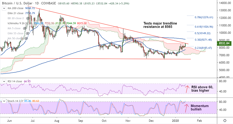 BTC/USD soared over 4 percent in early Asian trade as bulls in Bitcoin return to action. The pair was trading 5.42% higher on the day at 8543 at around 04:15 GMT. Price action is seen testing major trendline resistance at 8565.