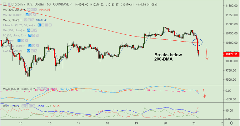 200H SMA is immediate resistance at 10478. Retrace above 20-DMA (10981) will negate any bearish bias for the pair.