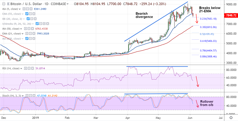 The pair is holding above 7700, just shy of 23.6% Fib at 7683. Break below eyes next major support at 55-EMA at 6900.