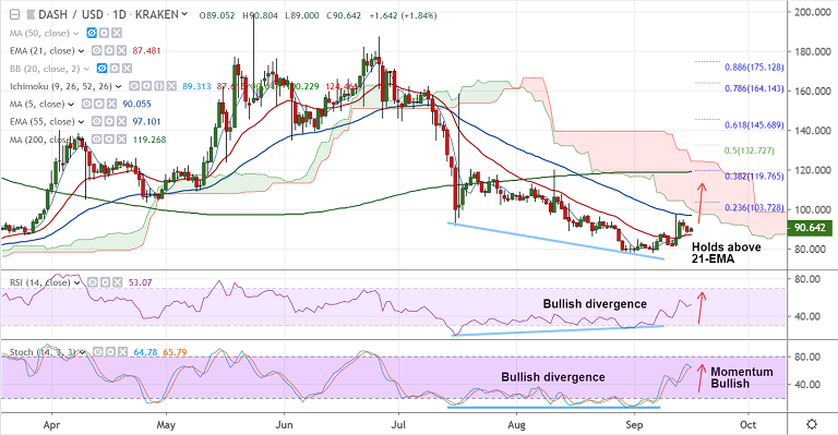 DASH/USD has halted 2 straight sessions of downside and was trading 1.84% higher at 90.64 at 09:10 GMT.