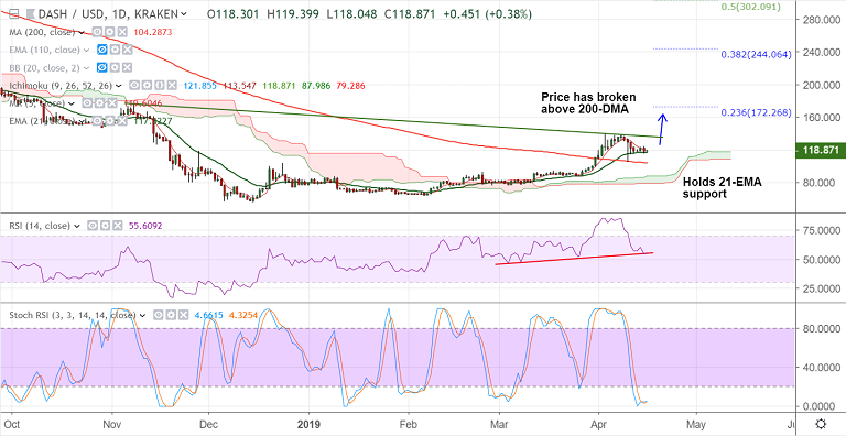 - DASH/USD is trading above 200-DMA (last in Mar 2018)