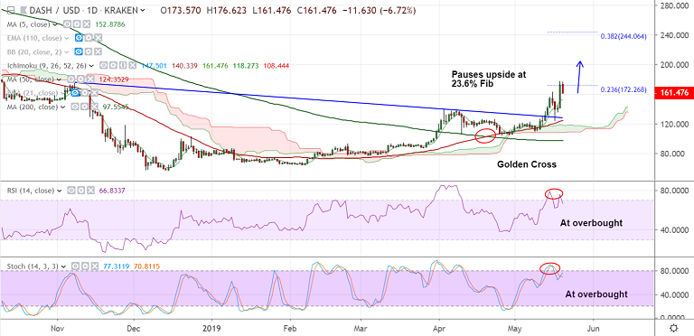 DASH/USD pauses upside at 23.6% Fib, bias still bullish
