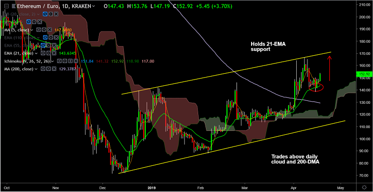 - ETH/EUR has edged above 200-DMA and daily cloud