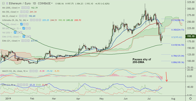 ETH/EUR pauses downside shy of 200-DMA, further weakness only on break below.