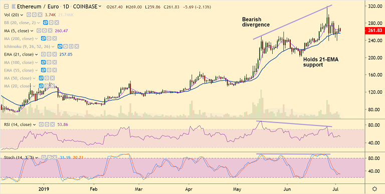 ETH/EUR was trading at 262.80 at 09:27 GMT, bias remains bearish.