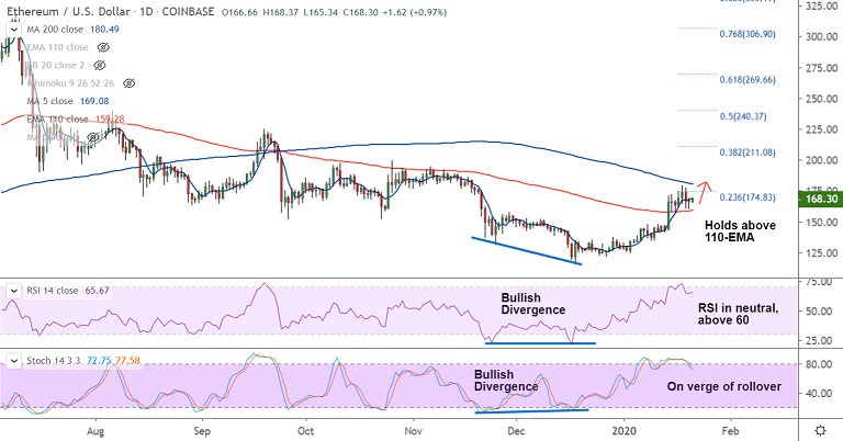 On the flipside, break below 110-EMA at 159.27 will see dip till 55-EMA at 150.20. Breach below 55-EMA negates near-term bullish bias.