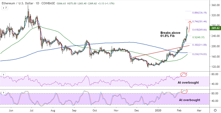 ETH/USD is extending previous session's surge, breaks above 61.8% Fib at 269.66.