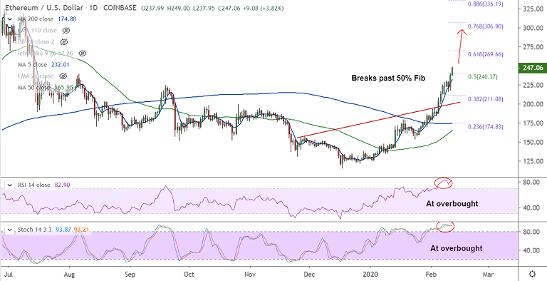 The pair has broken past 50% Fib retracement at 240.37 and is on track for further upside.