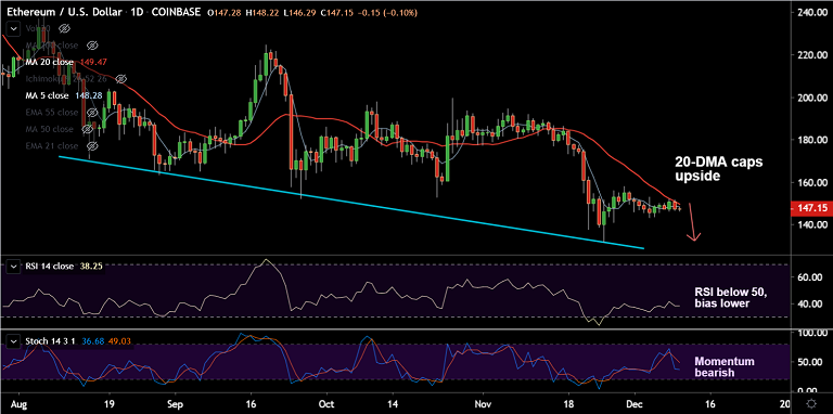 ETH/USD was trading rangebound on the day, at 147.03 at 04:55 GMT, after closing 2.24% lower in the previous session.