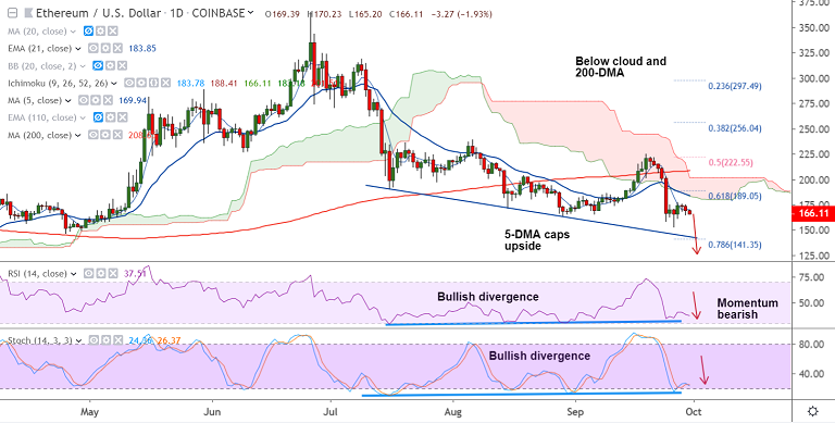 ETH/USD struggles to extend gains, retraces below 5-DMA, bias bearish.