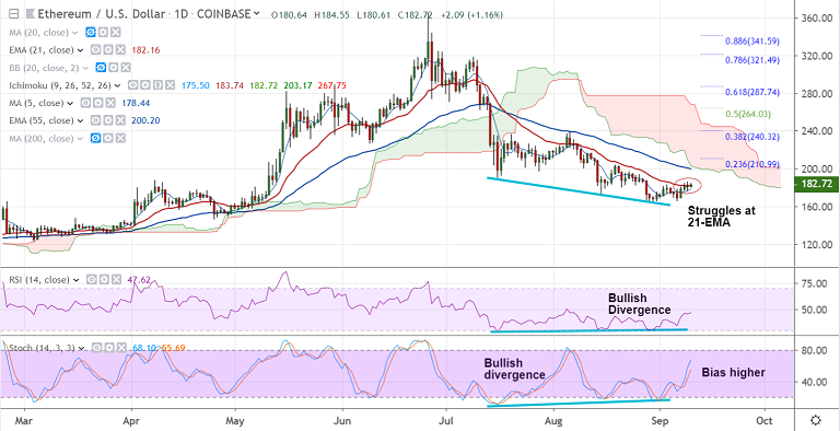 ETH/USD trades largely rangebound around 21-EMA resistance, bias is turning slightly bullish.