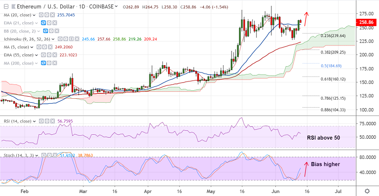 Retrace below 21-EMA could see weakness till 55-EMA at 223.06. Bullish invalidation below 200-DMA.