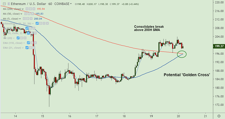 ETH/USD has paused upside, trades 1.16% lower on the day at 199.07 at 04:50 GMT.