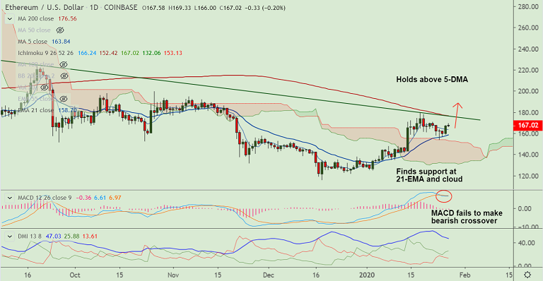 ETH/USD was trading largely rangebound on the day with session high at 169.33 and low at 166.0.