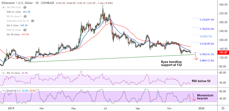 Next major support is seen at 132 (trendline), violation there will open further downside. 20-DMA is major resistance at 148.11. Any minor bullishness only on break above.