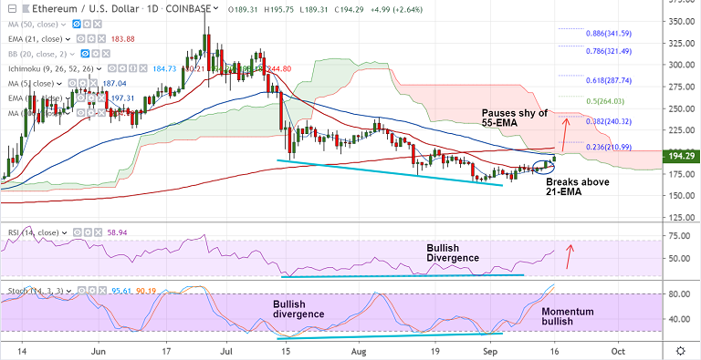 ETH/USD extends 21-EMA breakout, intraday bias is bullish.
