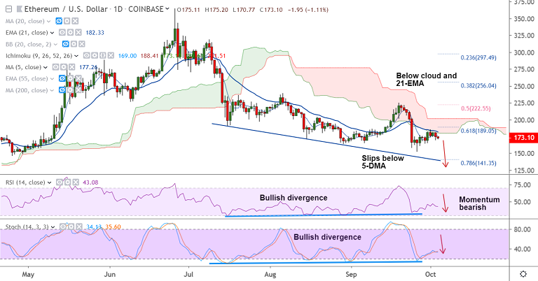ETH/USD resumes weakness after rejection at cloud and 21-EMA resistance.
