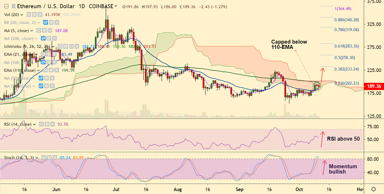 ETH/USD was trading at 188.82, down 1.47% at 05:35 GMT, close below 55-EMA could see weakness.