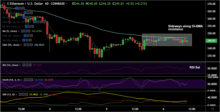 ETH/USD grinds sideways at 1H 55-EMA resistance, downside supported at 1H 50-SMA.