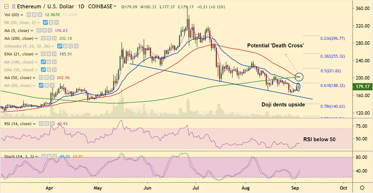 ETH/USD trades rangebound on the day, at 178.93 at 06:10 GMT, with session high at 180.33 and low at 177.37.