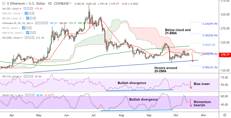 ETH/USD was trading 0.43% lower on the day at 179.81 at 06:25 GMT, intraday bias bearish.