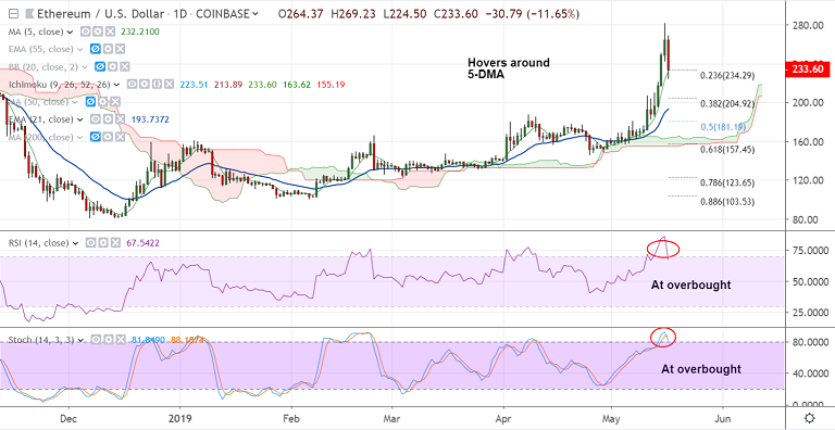 Immediate support below 5-DMA lies at 38.2% Fib at 204.92. Further weakness will see test of 21-EMA at 193