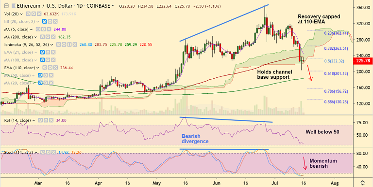 ETH/USD consolidates break below 110-EMA, bias remains bearish.