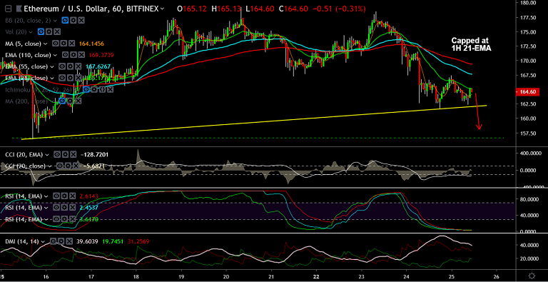 - ETH/USD slips below 21-EMA, bias is turning slightly bearish
