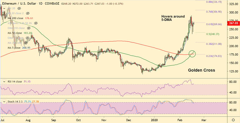 ETH/USD was trading largely muted at 267.54 at around 07:00 GMT, with session highs at 272 and lows at 263.71.
