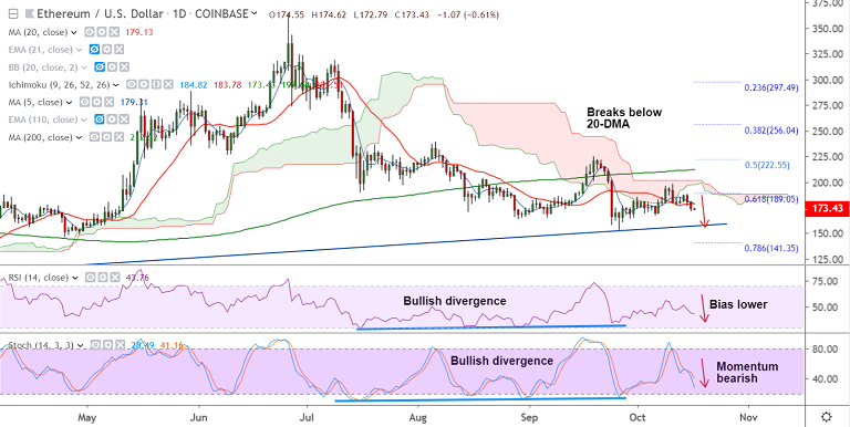 Price action has broken below 20-DMA support and is now on track to test Oct 6th lows at 167.50.