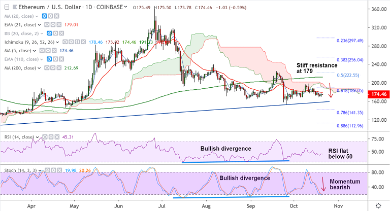 ETH/USD is struggling to extend gains, trades 0.59% lower on the day at 174.46 at 05:45 GMT.