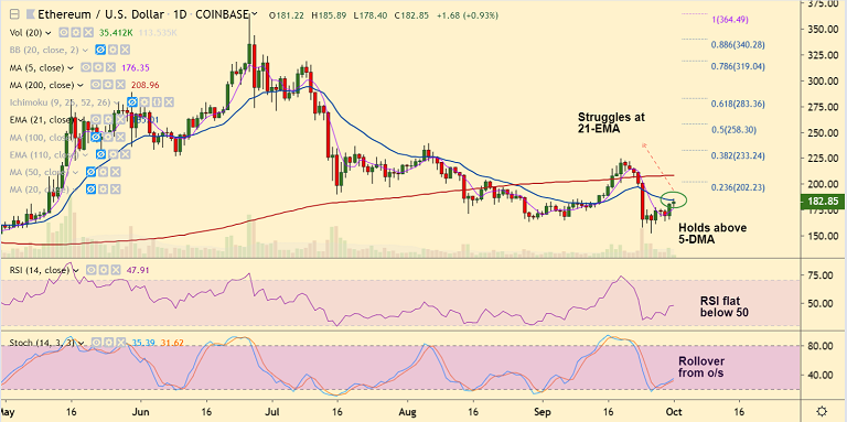 ETH/USD has paused upside at stiff resistance at 21-EMA (currently at 185.01).