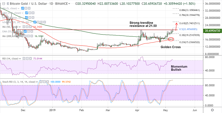 - Bitcoin Gold pauses upside at 22 handle, retraces below trendline resistance at 21.50