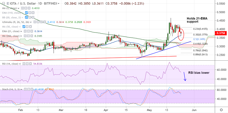 Break below 21-EMA will see weakness. Scope for test of 200-DMA at 0.3185. Retrace above 5-DMA (0.4007) negates bearish bias.