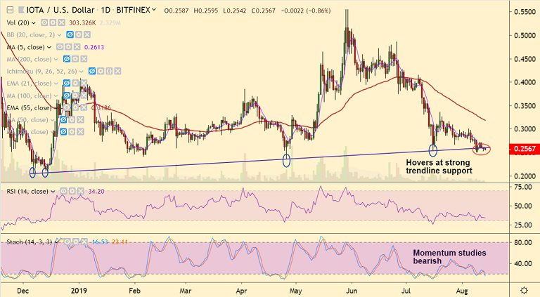 IOT/USD trades marginally lower on the day at 0.2560 at 06:00 GMT.