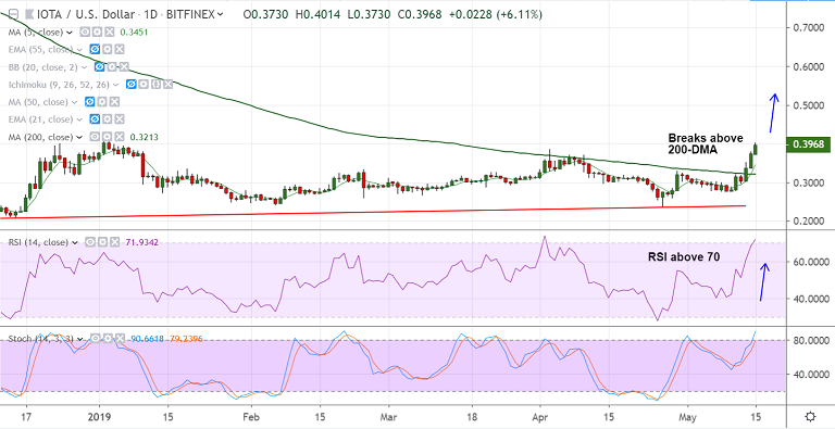 - IOT/USD price action has shown a decisive break above 200-DMA, scope for further upside