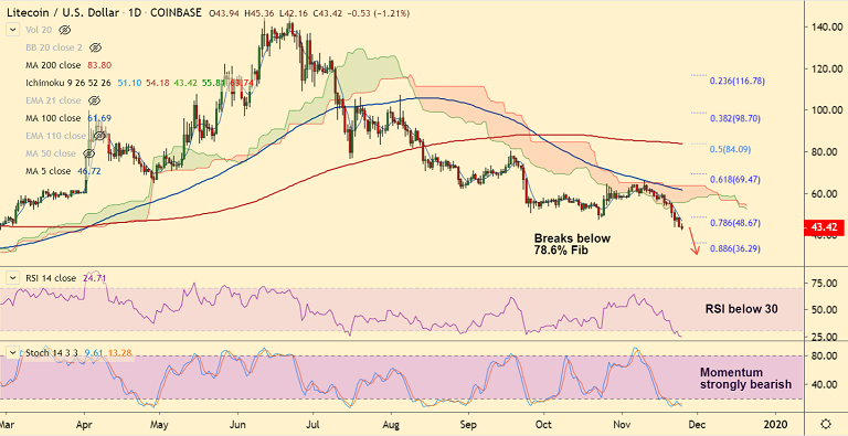 LTC/USD has edged higher from 9-month lows at 42.16, bias remains strongly bearish.