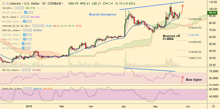 LTC/USD is extending gains for the 2nd straight session, bias higher.