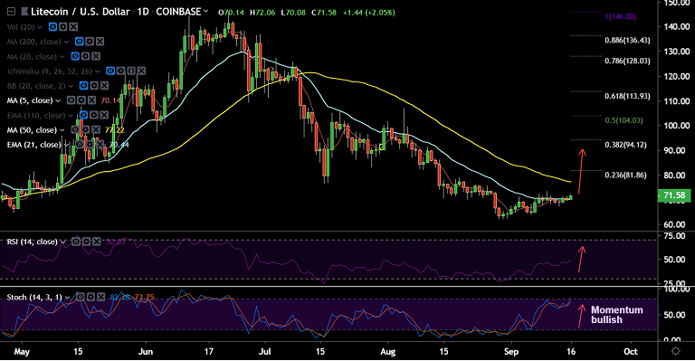 LTC/USD trades 1.95% higher on the day at 71.51 at 06:30 GMT, bias slightly bullish.
